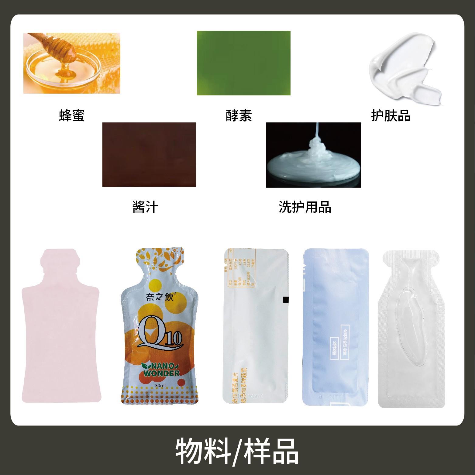 適用于各行業(yè)中酵素、果汁、漱口水、洗護(hù)用品、染發(fā)劑、化妝品小樣等醬料、液體物品的雙列異形袋計量包裝。